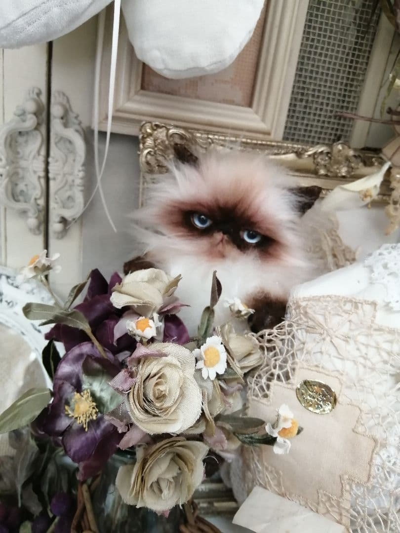 福を告げるという幻獣。ひゃくにじゅうに、ひゃくにじゅうさんばんめの獣人福告幻獣なお狐様。全長は2足立ちさせて耳の先から踵あたりまでおよそ23cm、尻尾は付け根から1番長い毛先までおよそ18cmのデフォルトサイズとなります。顔にはラドールプレミックスを使用、骨組みにはトイスケルトンを使用しています。ぽこっとした切り替えパーツを関節部に付けているので、ポージングの目安にしてください。本体はフェイクファーを使用。手足を曲げる時は優しく曲げてあげてください。中の針金は経年劣化か無理な曲げ方で折れる場合があります。取り扱いにはご注意下さい。耳は輪っか状に骨組みをいれているので角度を変えたりできます。しっぽを使えば立つことができます。背中の羽はブローチピン、耳の羽はクリップ、眼帯はパテを使用して目に貼り付けてご使用ください。顔の模様はブラッシングすると色の境目がぼやける可能性がありますので、そこの部分だけはブラッシングしないようお願い致します。顎の下から頬に向けて指で数回撫でていただければ綺麗なフォルムが出ます。ブラッシングはコーム、歯ブラシなどでお手入れできます。アートドール制作は完全手縫いなので拙い部分もあるかと思われます。基本水濡れはNG、汚れなどがでた箇所によってメンテナンスできる方の購入を推奨します。2体セットです。1体26000円×2です。